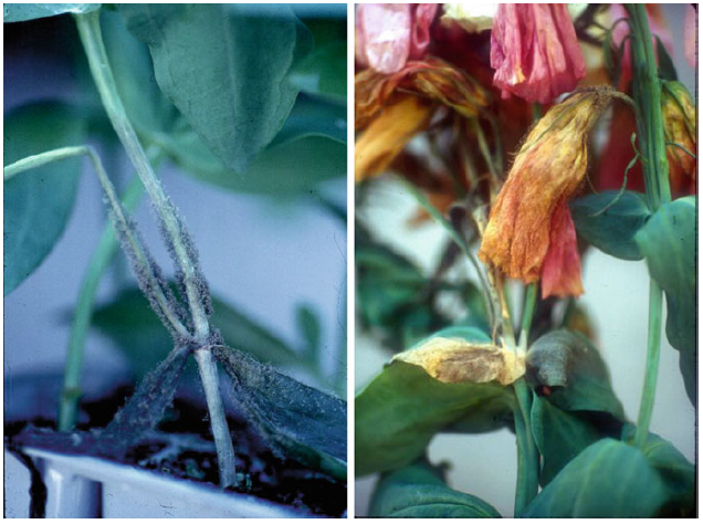 Các bông hoa và mô bị trầy xước rất dễ bị lây bệnh và loại nấm này thường bám vào các vị trí như vậy để xâm nhập cây khỏe mạnh. Phần thân cây tiếp xúc với đất thường bị bệnh trước.